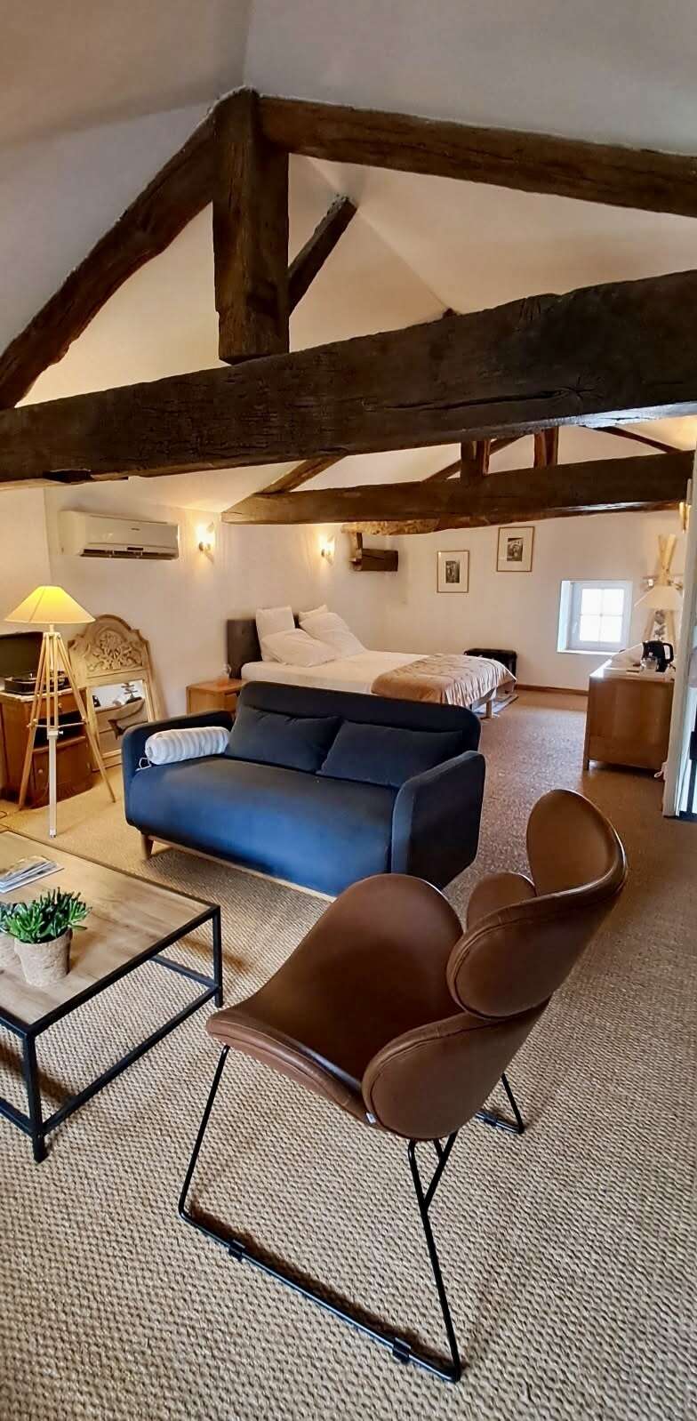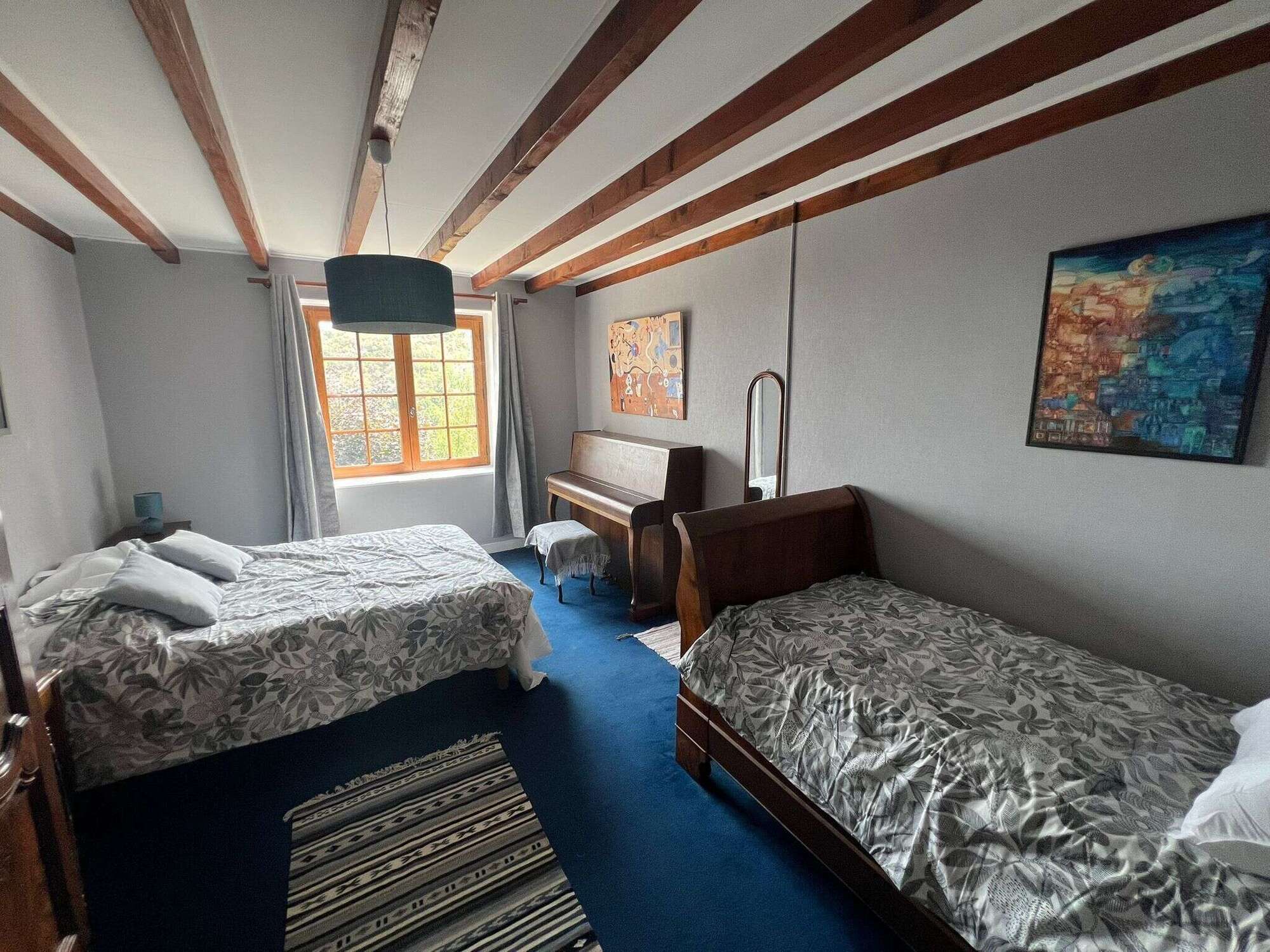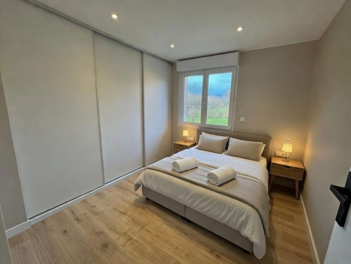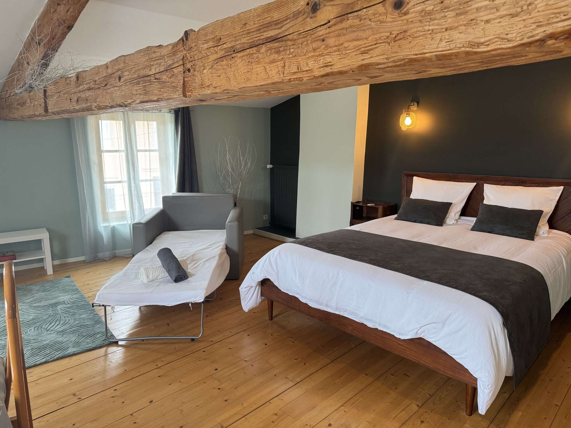 - Chambre spacieuse et cosy : Une grande chambre élégamment décorée avec des tons doux et chaleureux, idéale pour se reposer après une journée de découvertes. Lit double 160x200, lit gigogne 90x200.