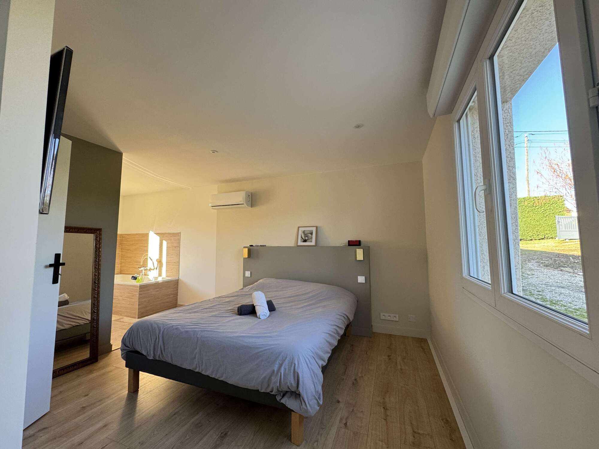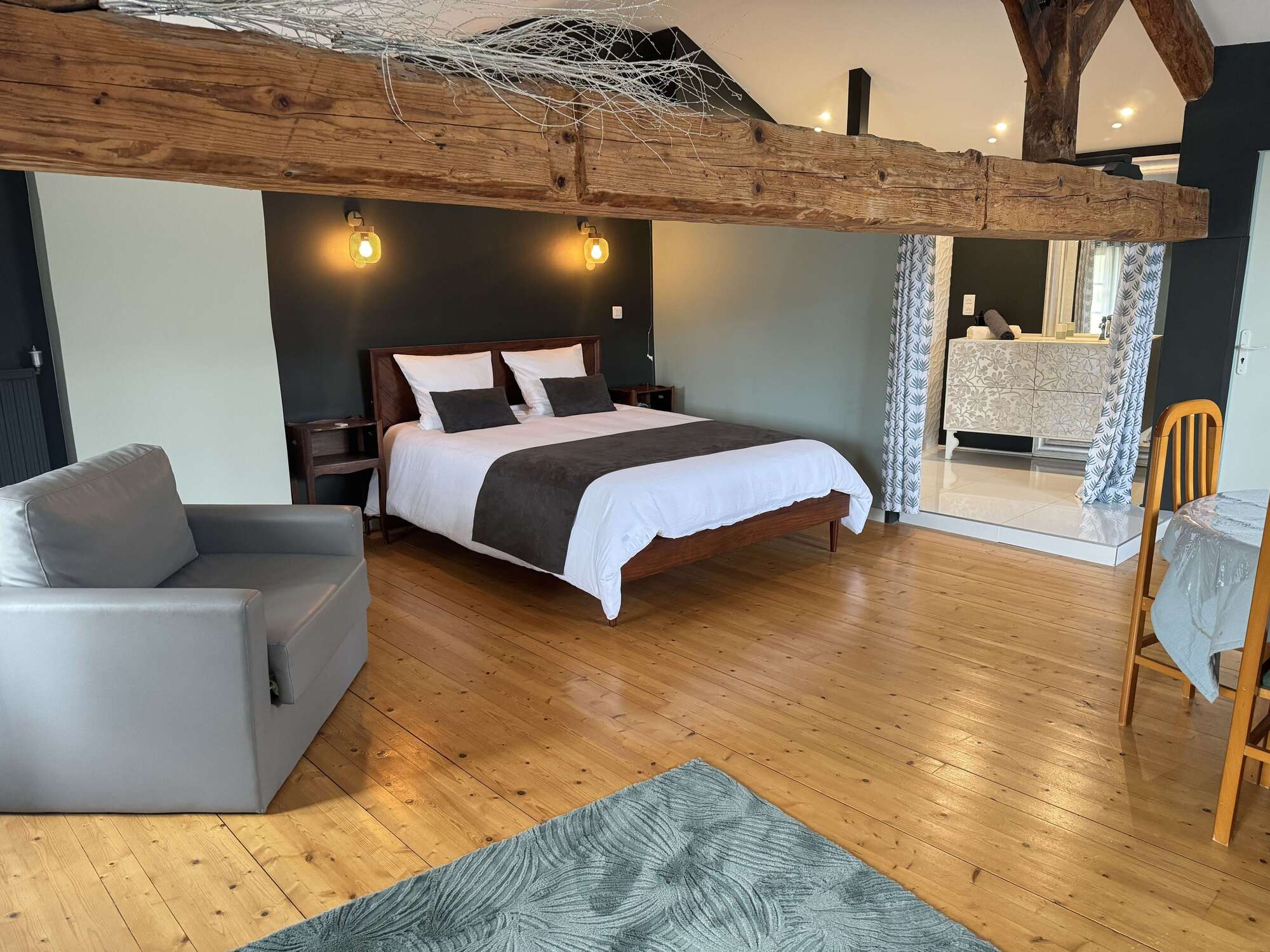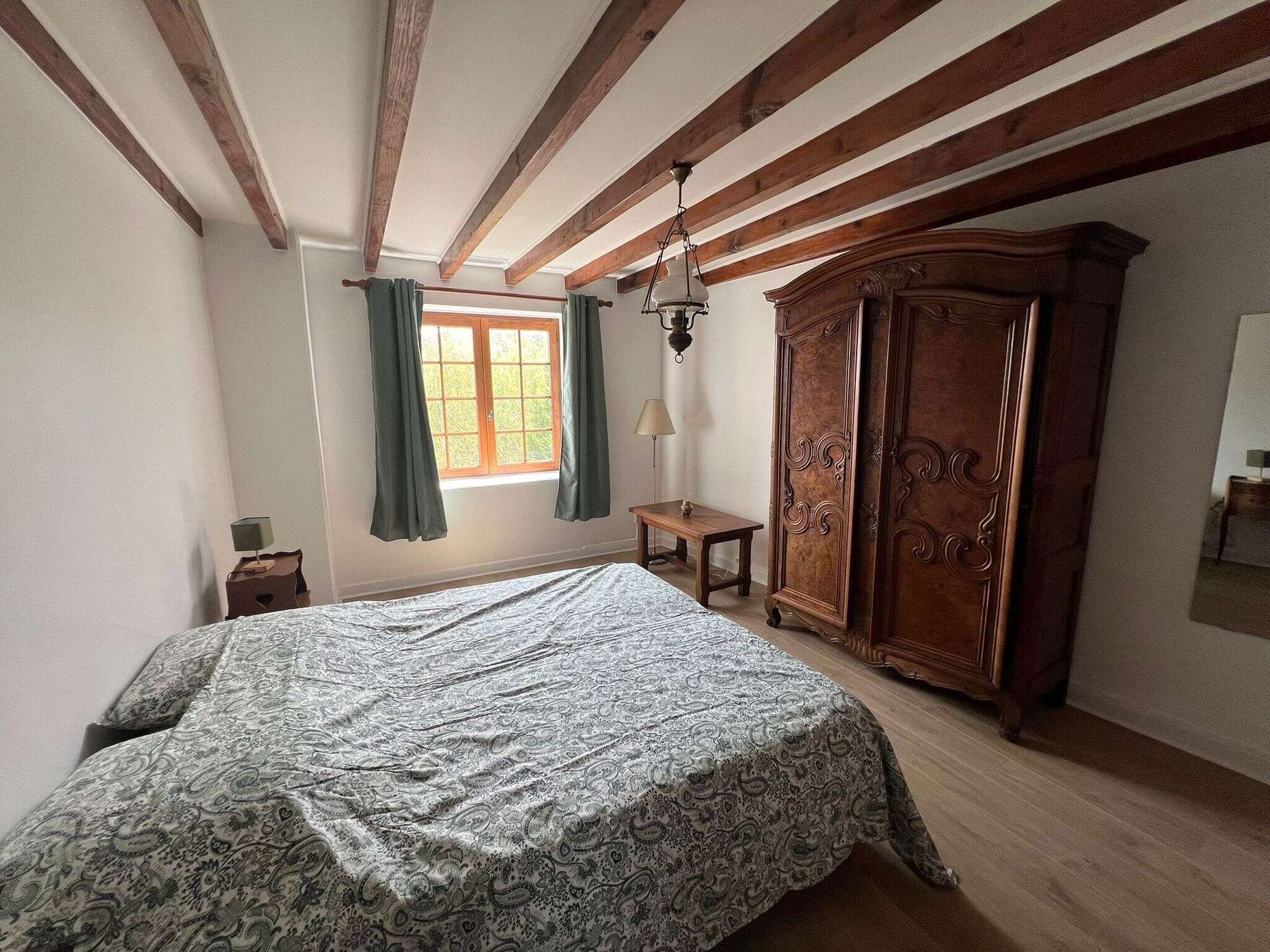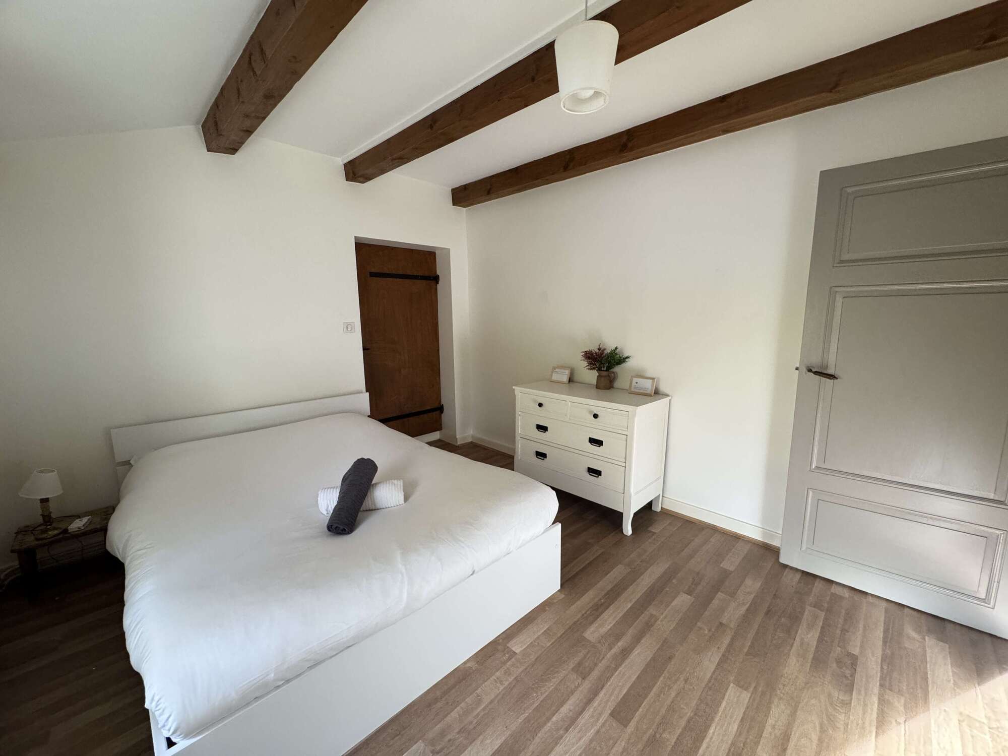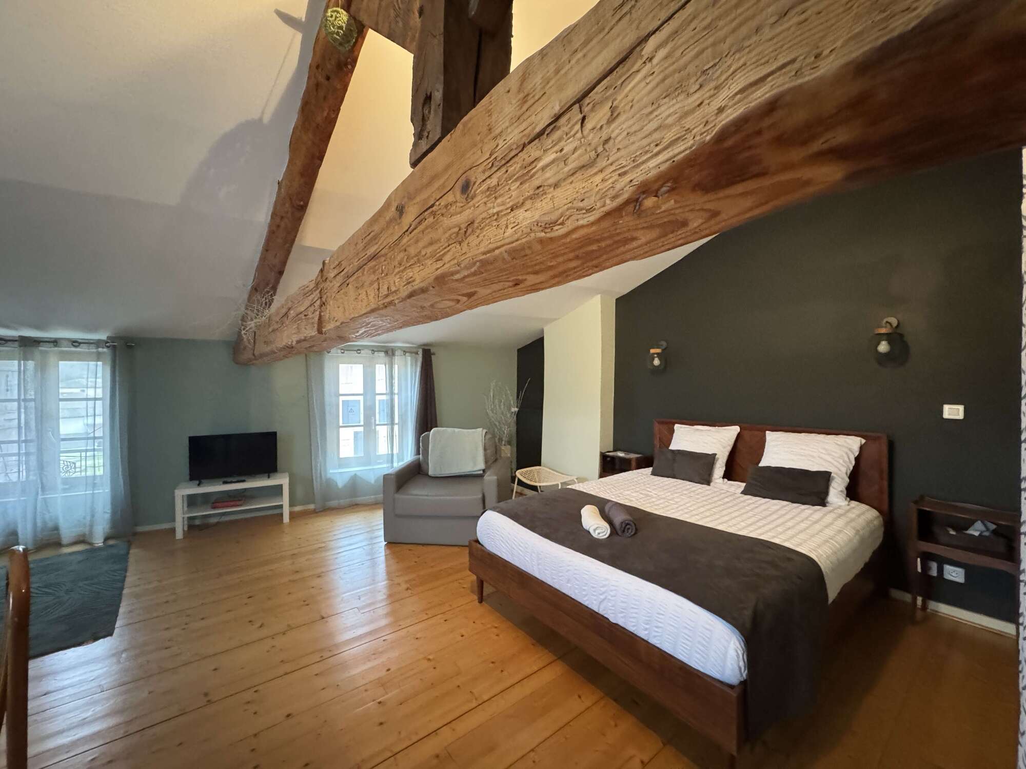 - Chambre spacieuse et cosy : Une grande chambre élégamment décorée avec des tons doux et chaleureux, idéale pour se reposer après une journée de découvertes. Lit double 160x200, lit gigogne 90x200.