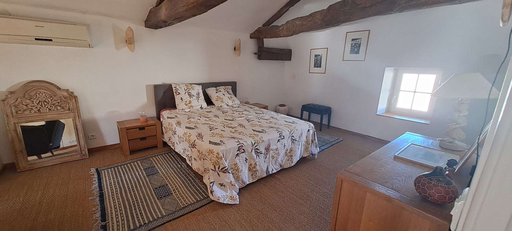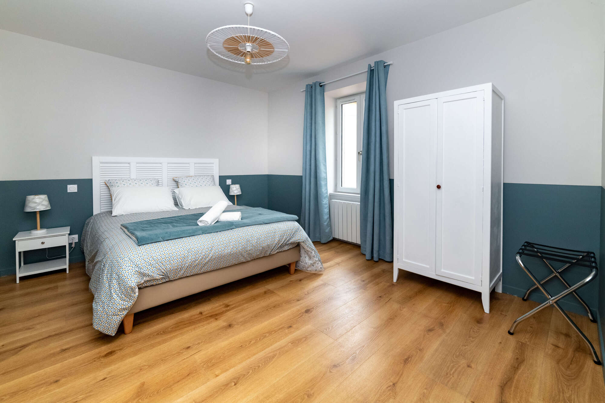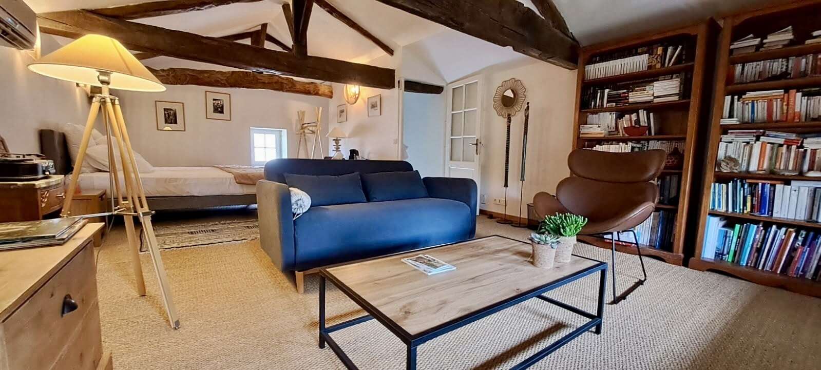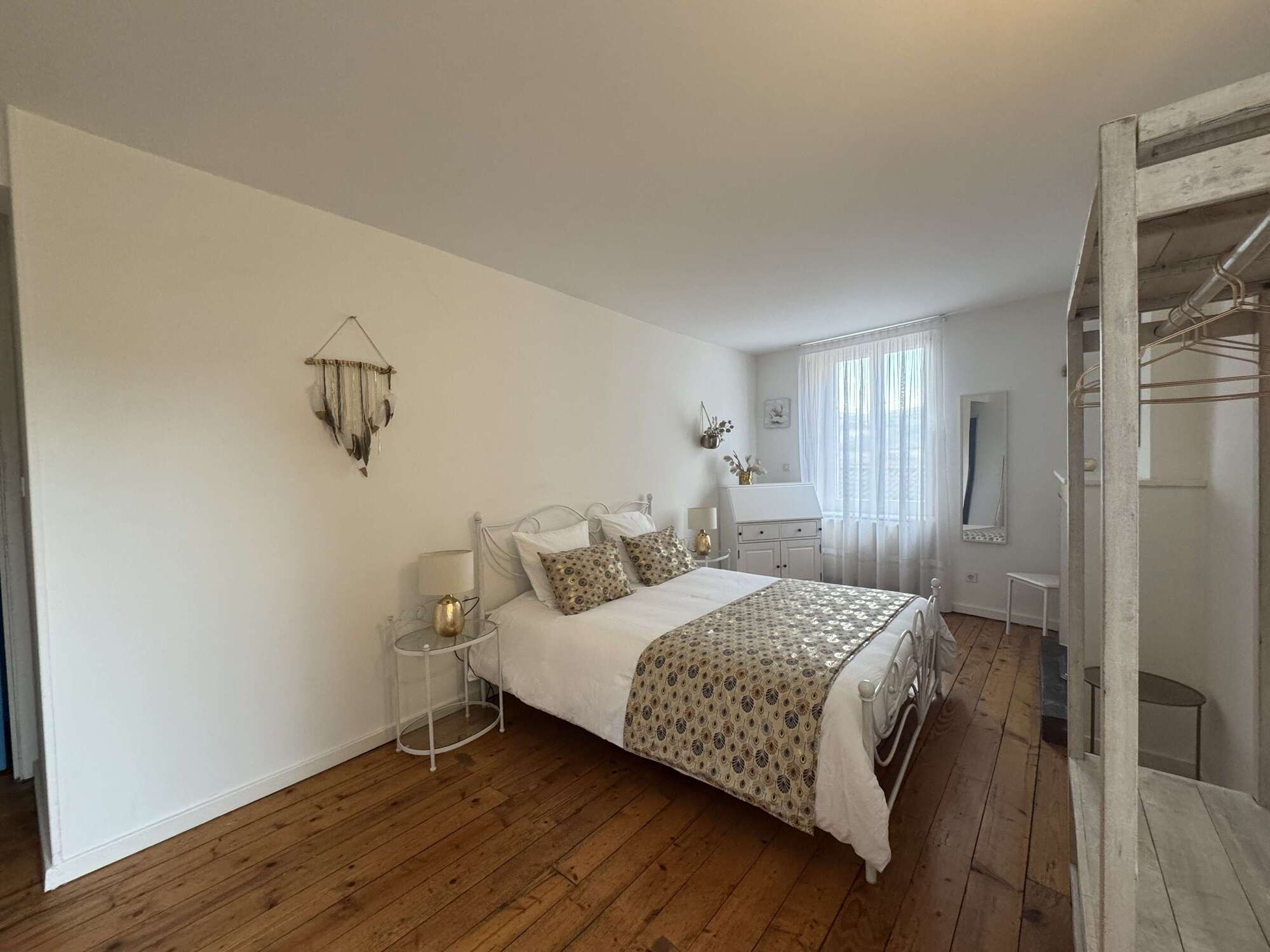 - Chambre spacieuse et cosy : Une grande chambre élégamment décorée avec des tons doux et chaleureux, idéale pour se reposer après une journée de découvertes. Lit double 160x200, lit gigogne 90x200.