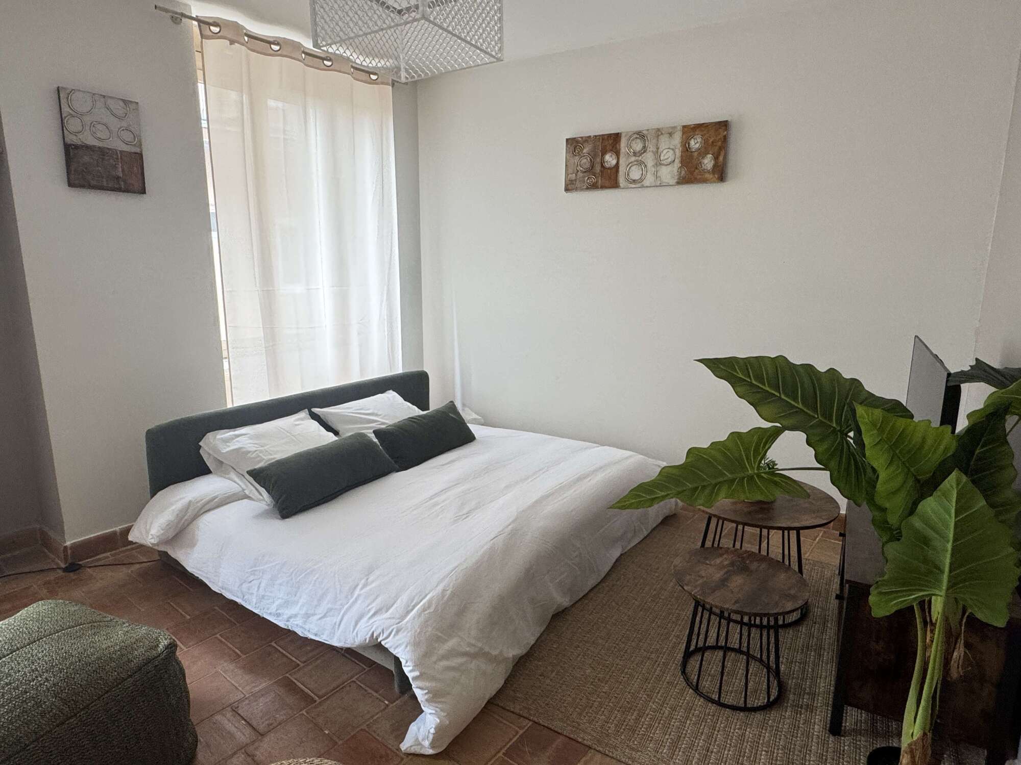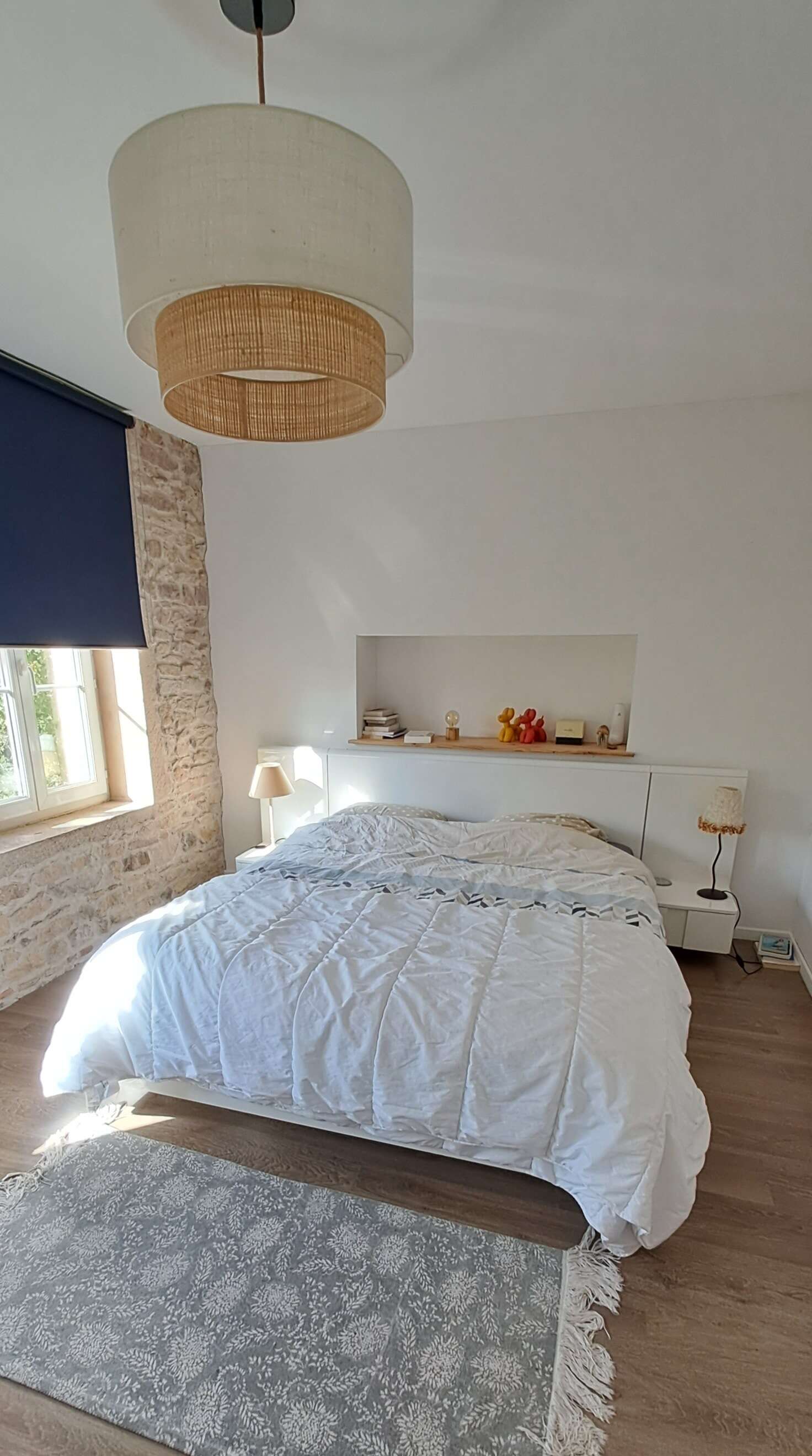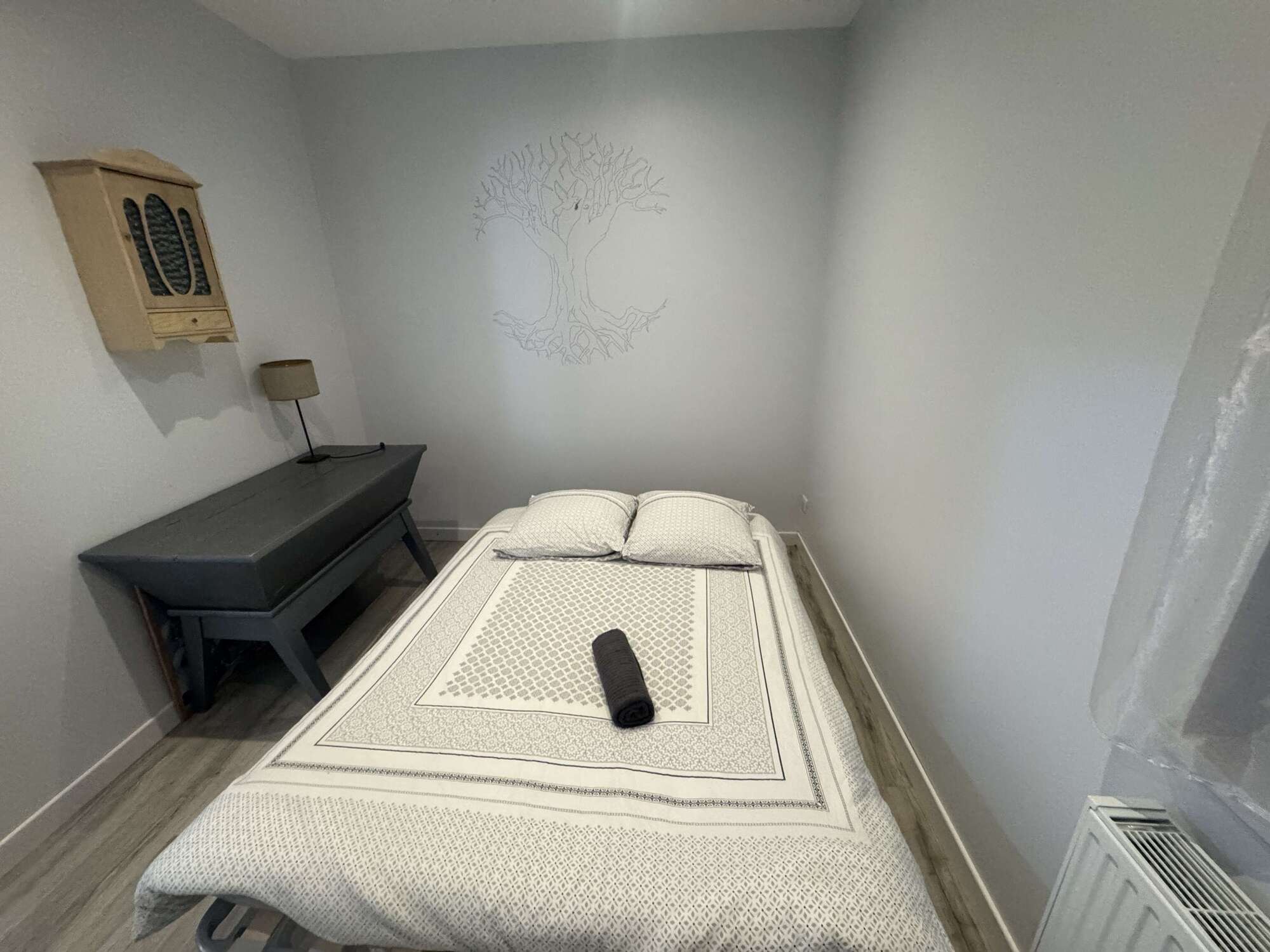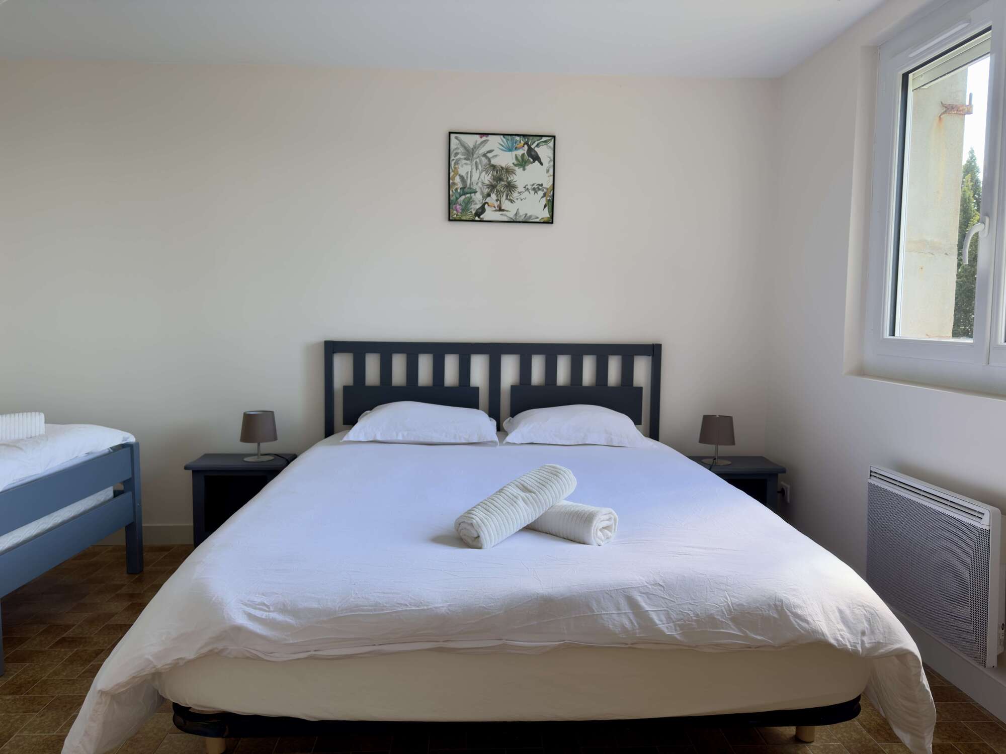 - Chambre spacieuse et cosy : Une grande chambre élégamment décorée avec des tons doux et chaleureux, idéale pour se reposer après une journée de découvertes. Lit double 160x200, lit gigogne 90x200.