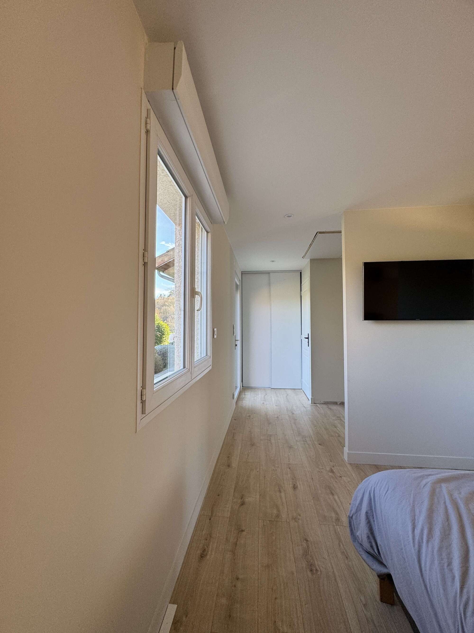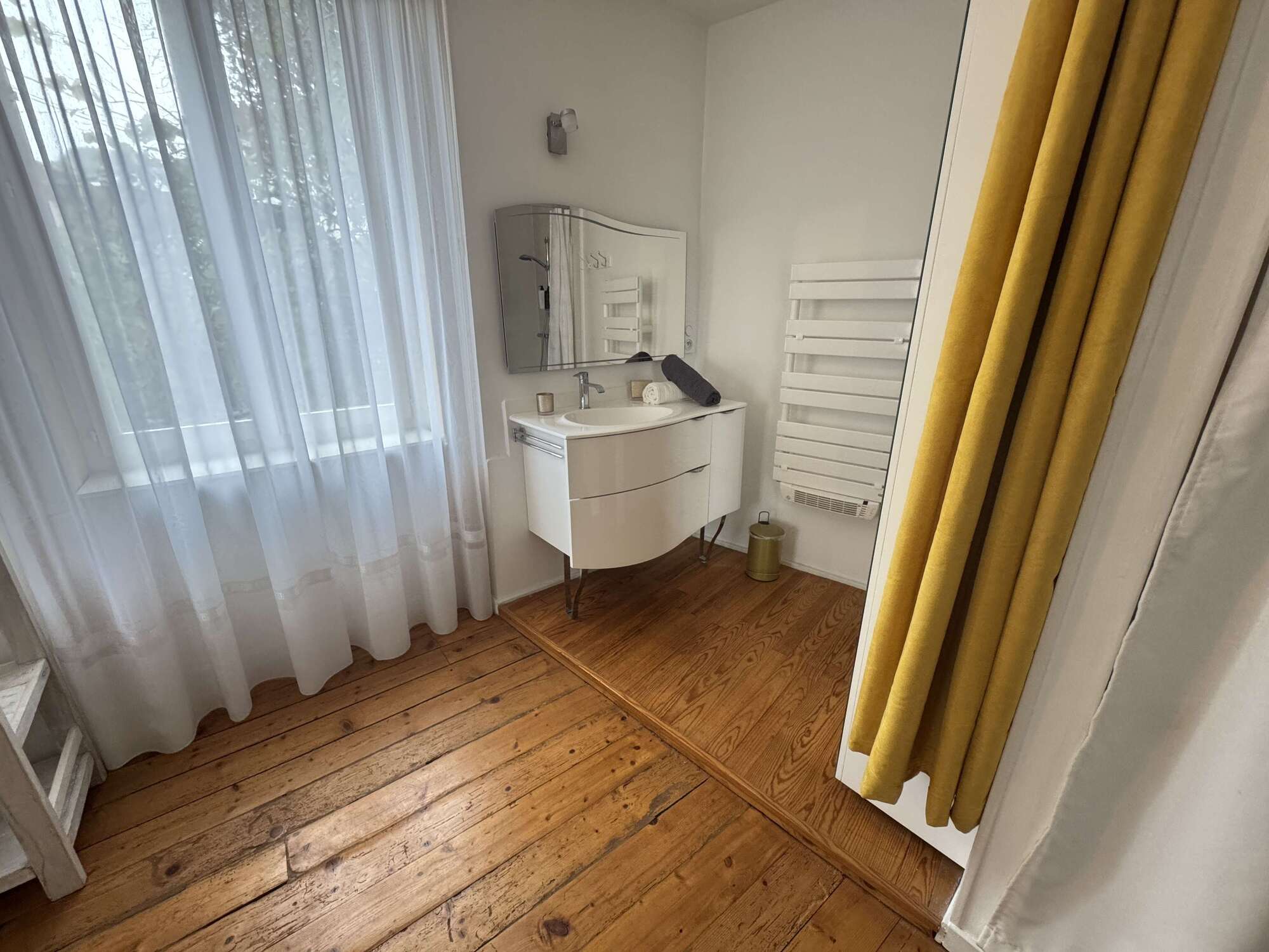 - Salle de bain et toilettes situés à l’étage inférieur (non attenants à la chambre)