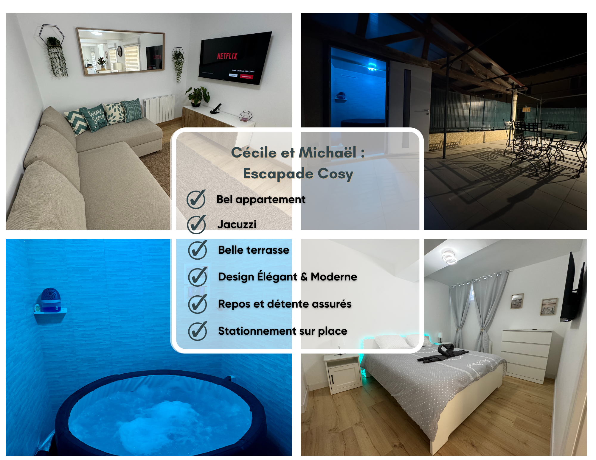 Bienvenue dans notre charmant appartement, idéal pour un séjour relaxant à quatre personnes. Profitez d'une grande terrasse où vous pourrez vous détendre et d'un jacuzzi privé.