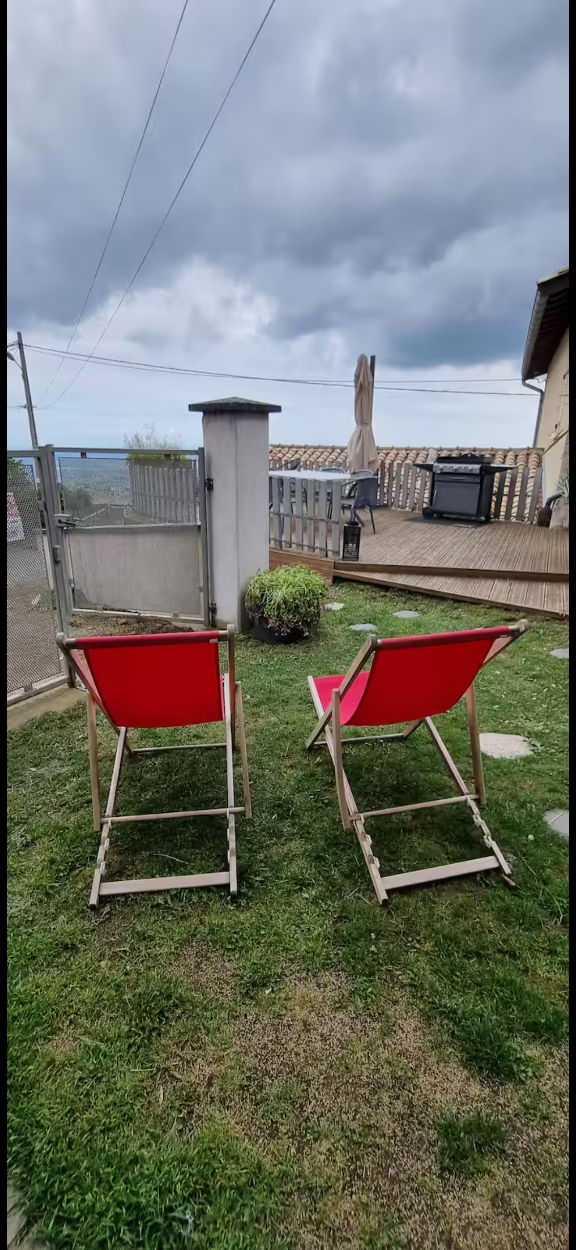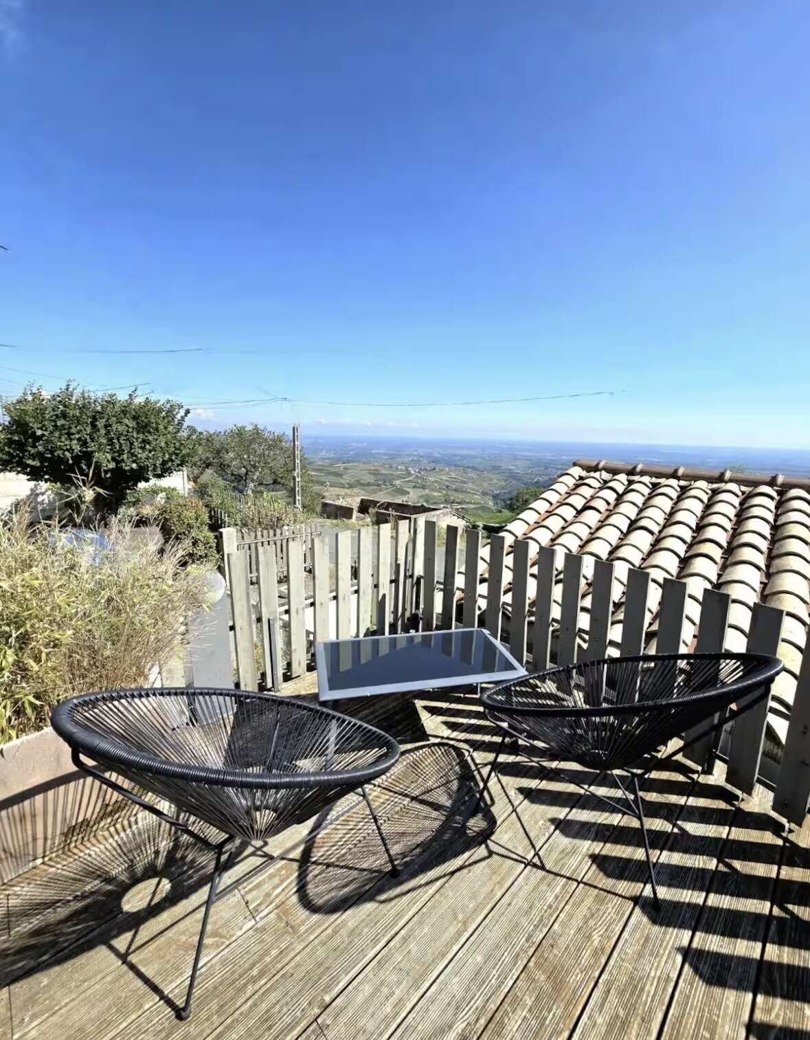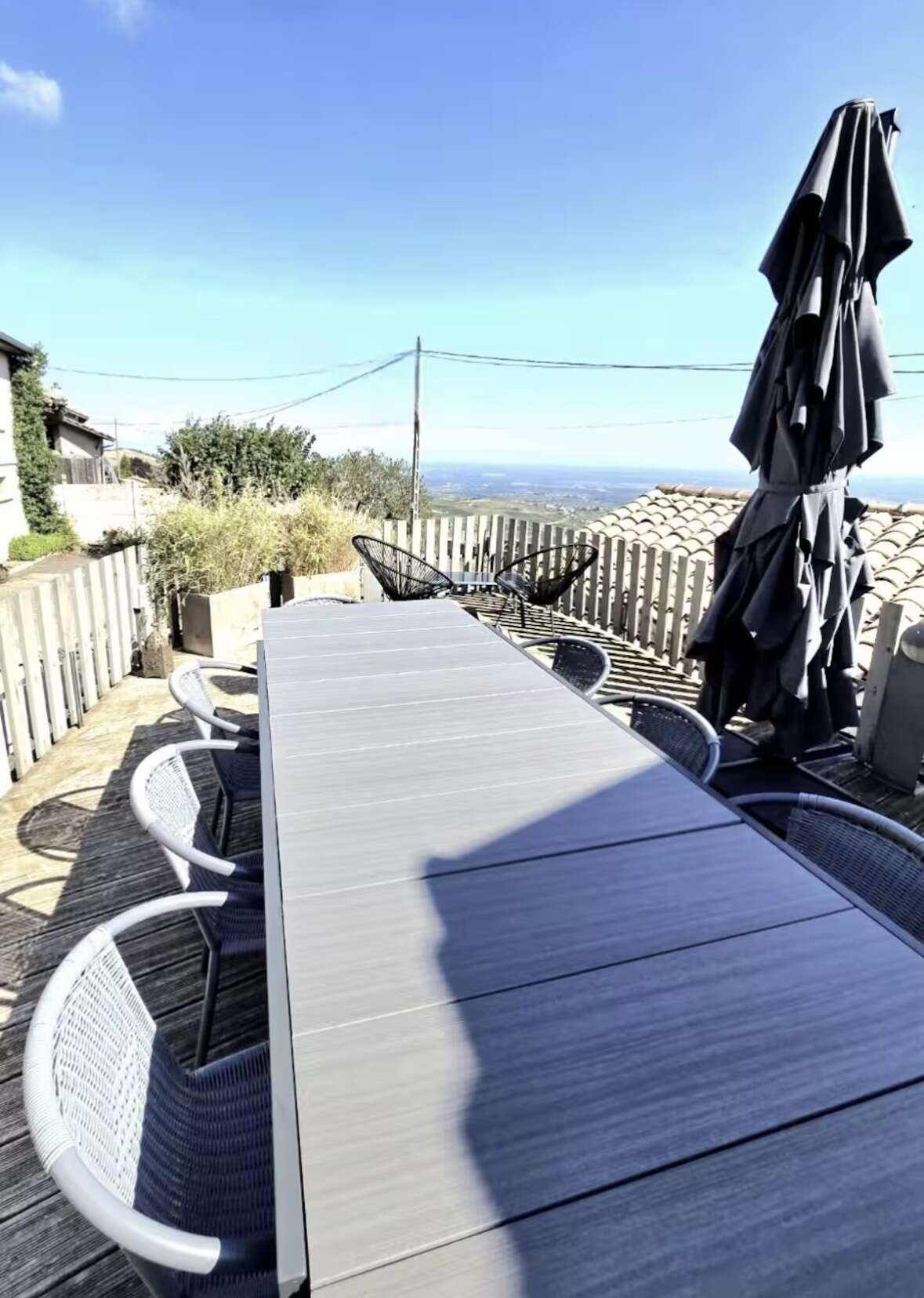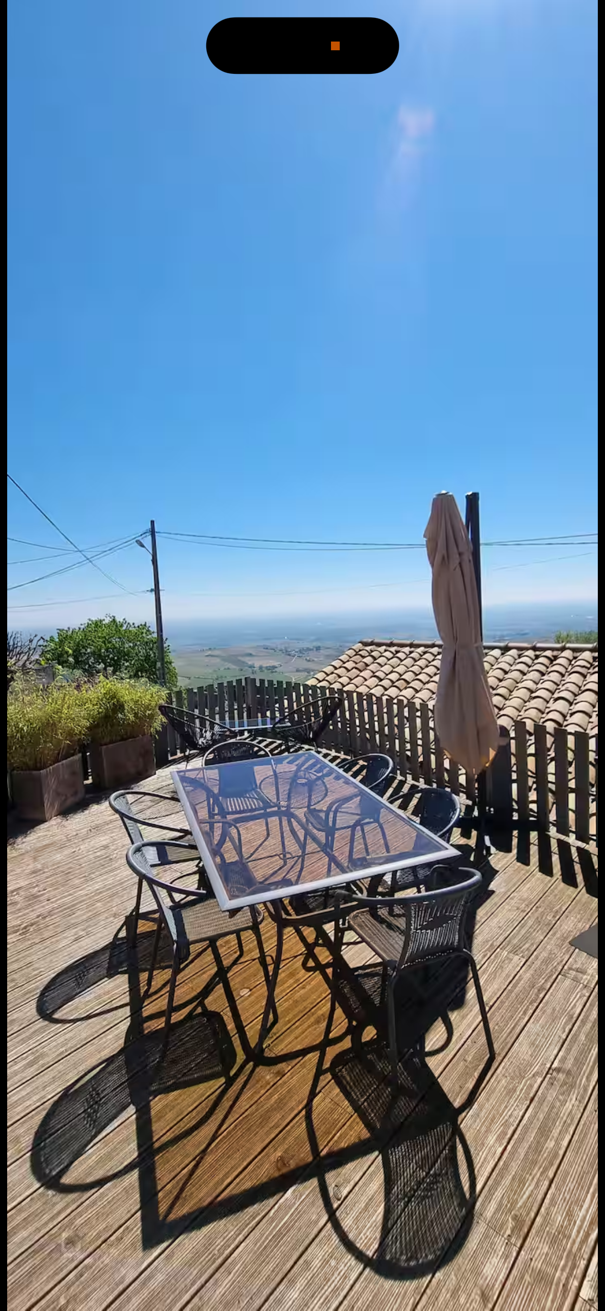 À l’extérieur, deux terrasses avec vue prolongent les espaces de vie : une grande terrasse plein sud de 50 m² avec table 10 places, parasol et plancha à gaz, ainsi qu’une terrasse couverte pour 2 à 4 personnes. Un petit espace enherbé complète l’ensemble.