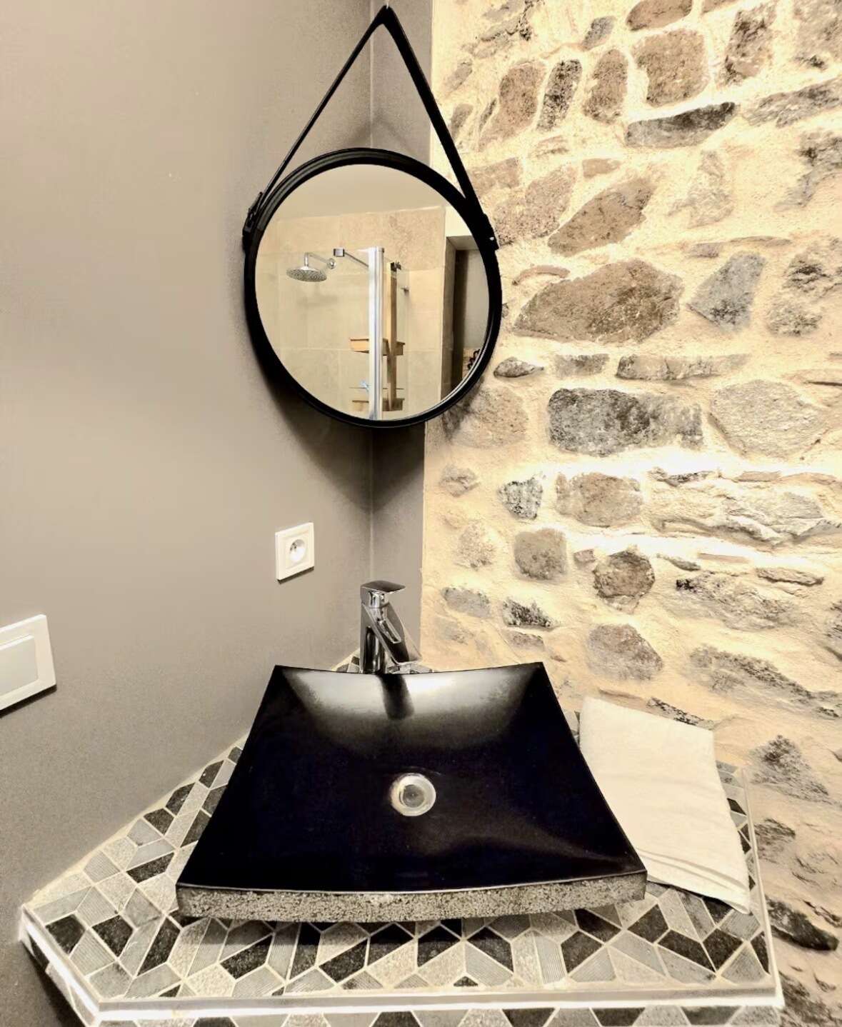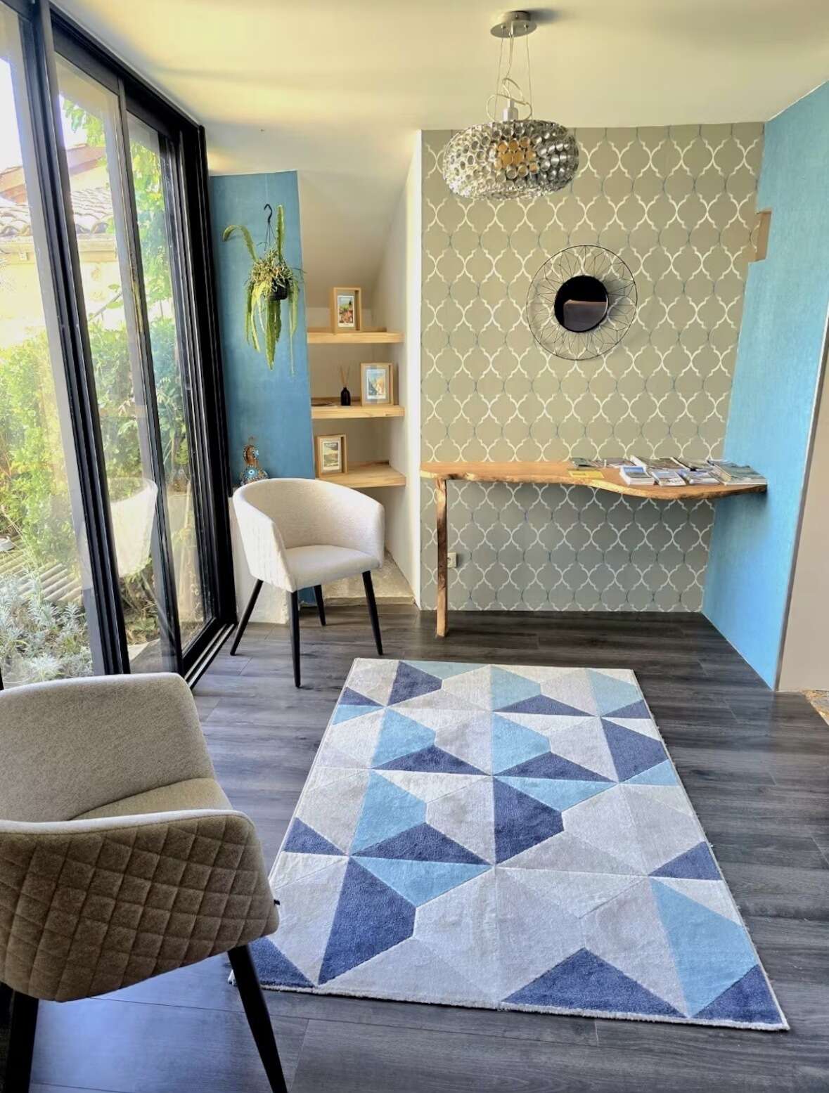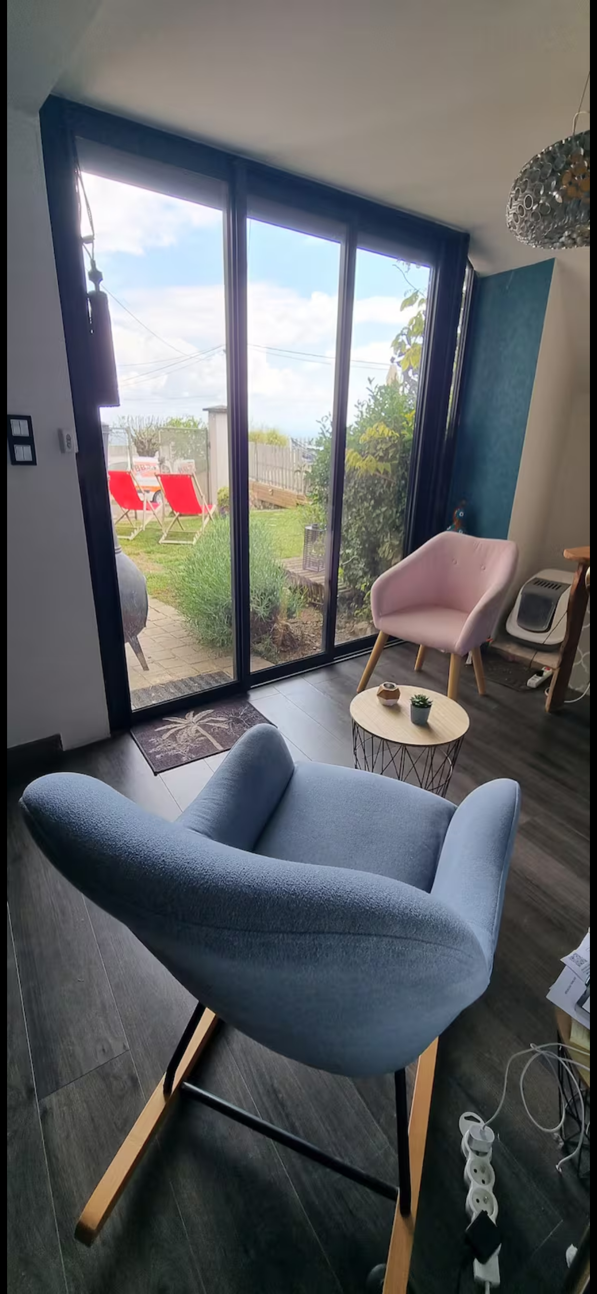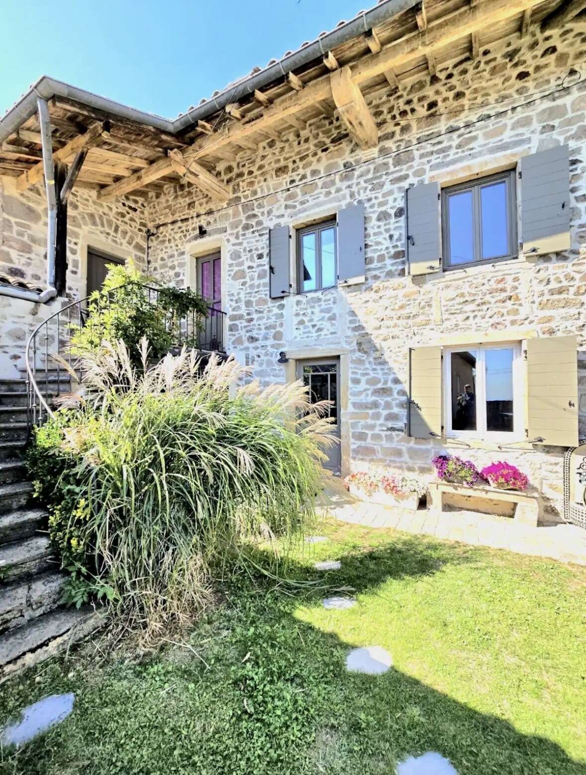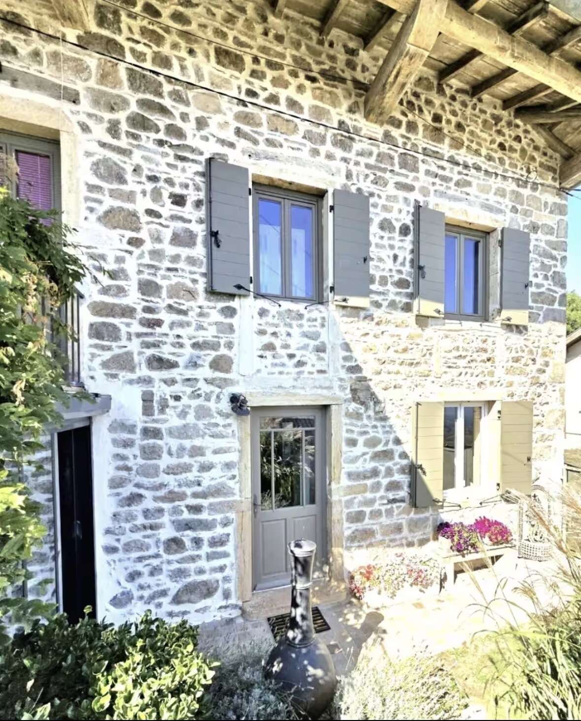 À l’extérieur, deux terrasses avec vue prolongent les espaces de vie : une grande terrasse plein sud de 50 m² avec table 10 places, parasol et plancha à gaz, ainsi qu’une terrasse couverte pour 2 à 4 personnes. Un petit espace enherbé complète l’ensemble.